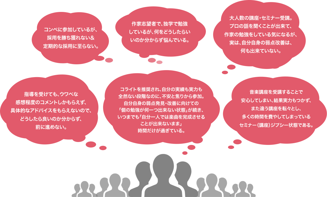 コライトを推奨され、自分の実績も実力も全然ない段階なのに、不安と焦りから参加。自分自身の弱点発見・改善に向けての「個の勉強が何一つ出来ない状態」が続き、いつまでも「自分一人では楽曲を完成させることが出来ないまま」時間だけが過ぎている。